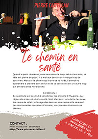 Contenu : Ce spectacle est destiné à sensibiliser les enfants à l’hygiène, aux règles de propreté et à la santé. Sont abordés : la toilette, les poux, les coups de soleil, le lavage des dents et des mains, l’alimentation et le sommeil. Les marionnettes racontent l’histoire, les chansons illustrent ces thèmes.